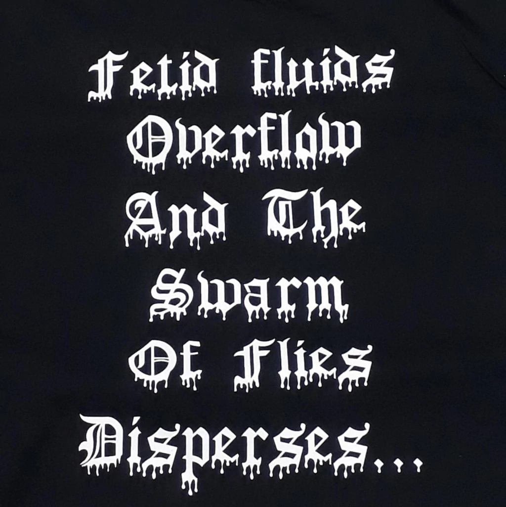 E no verso a frase "Fetid fluids overflow and the swarm of flies disperses...".
