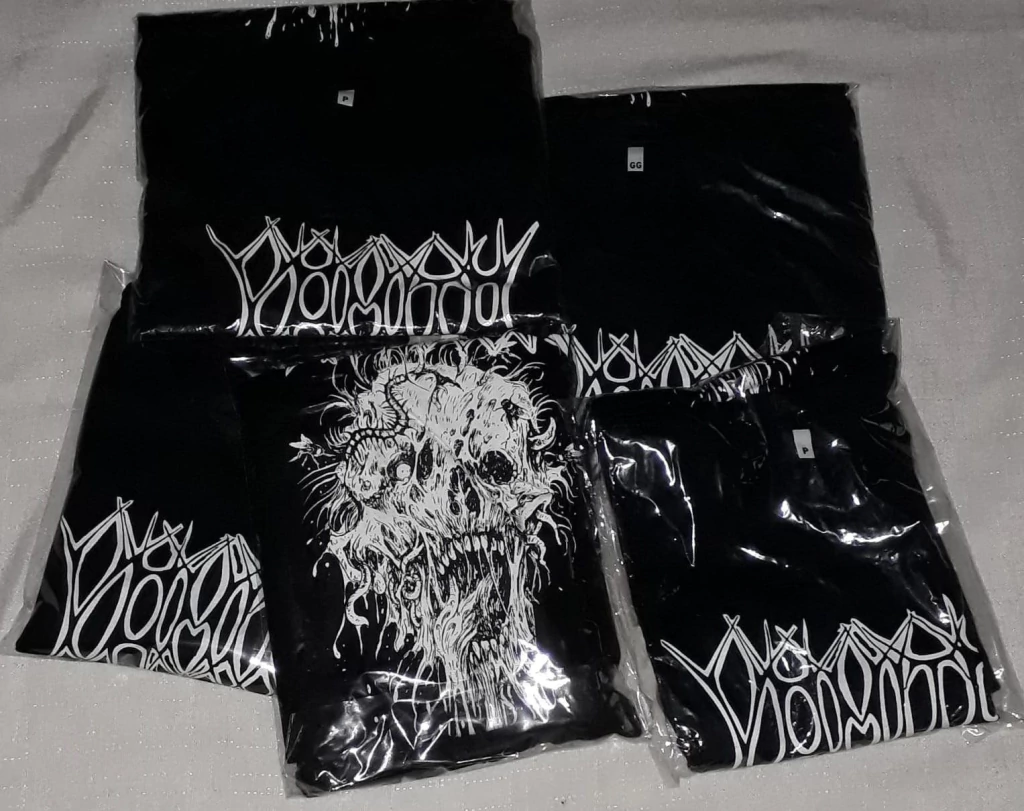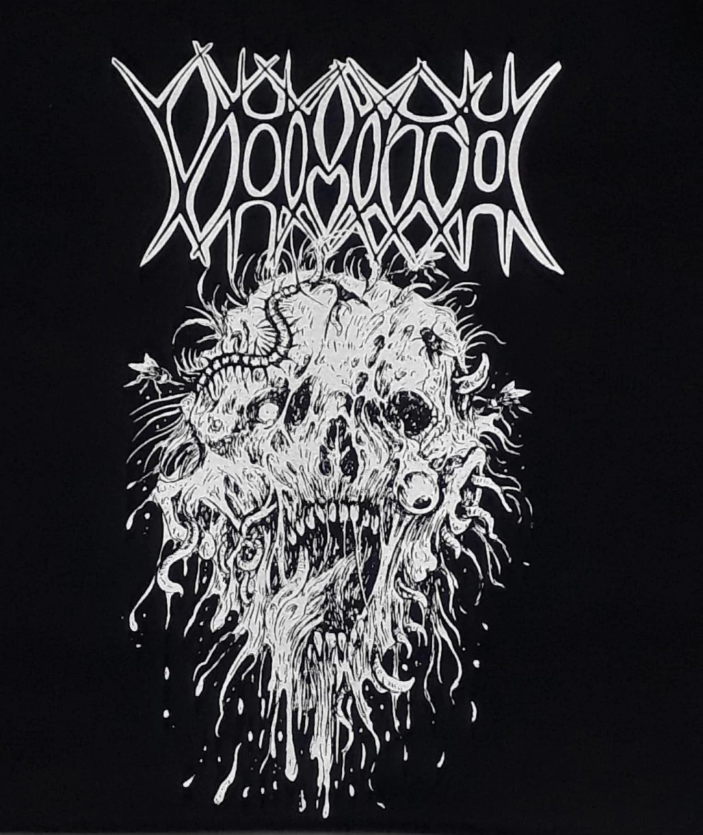 Na frente da camiseta, desenho da cabeça em decomposição com logo, na cor branca.